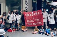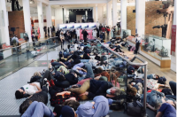 'Demonstrators attach themselves to railings in reaction to museum taking funding from oil firm for Our Future Planet show':